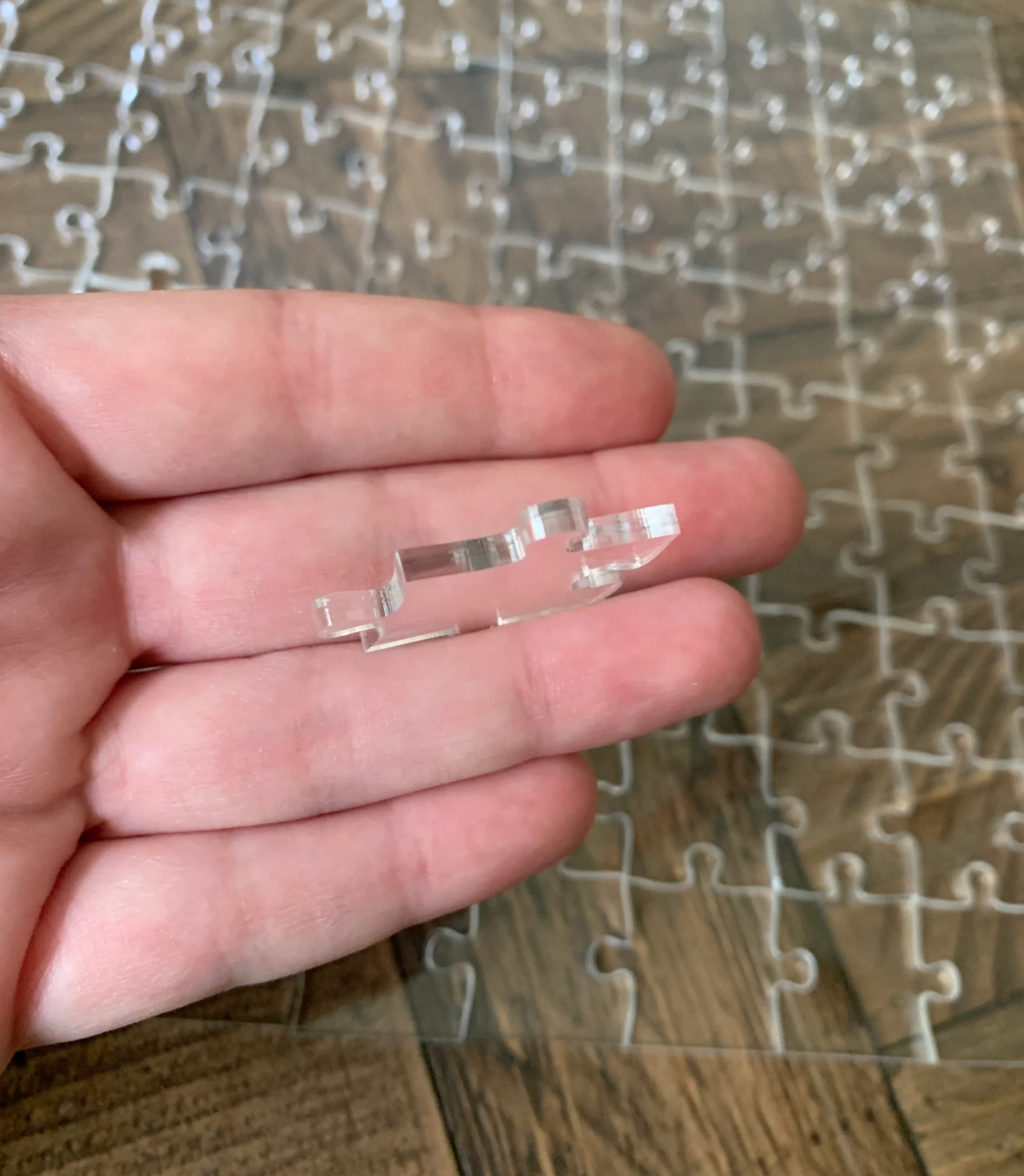 You'll find that out very quickly with this clear acrylic puzzle. Each piece is laser cut and looks like it fits in multiple places, but there's only one spot for each piece. It's also dual-sided which means that it may have to be flipped to work.